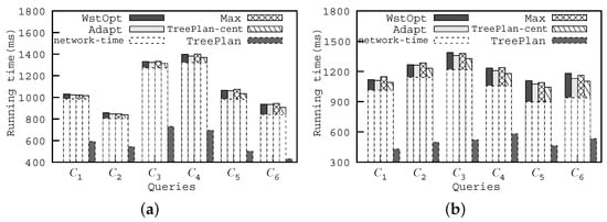 In each edge server node, the inverted lists for each word in the subset of dataset are built. The inverted lists are ordered sets that contain the IDs of files. For the source file dataset, we collected the real Boolean queries from the online library and forums (http://www.regexlib.com, accessed on 27 December 2021), which aim to find files that contain certain keywords. Among the collected real queries, we used 80 queries whose evaluation results are not empty in this dataset. For the Medline dataset, we used a full-day’s query log of PubMed that was obtained from the NLM FTP site (refer to [51] to access the query log). These queries were issued by 626,554 distinct users, in which we also chose 80 queries that contain and/or operators as Boolean queries.
