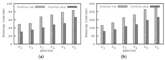 In this experiment, we tested the effect of an optimization technique that skips the invalid candidate elements which cannot be the final evaluation results (see Section 5.2.3). We used - and - to respectively represent our proposed algorithms that employ the optimization technique and without optimization. The results are shown in Figure 8. In different dataset and queries, - always spends less running time than - since - checks fewer candidate elements. The gap of the running time between the two algorithms is most obvious for the queries in in source file dataset, i.e., the running times of - against - are 40.47 ms and 67.05 ms.