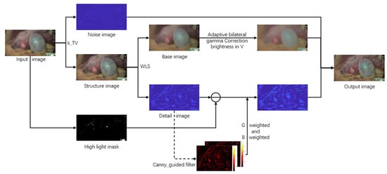 The framework flow of the algorithm is shown in Figure 2. which is inspired by the different absorption characteristics of human tissues for different spectra and the multipath processing mechanism. First, to prevent the effect of noise on microvascular imaging, the input map was decomposed into structural and noise layers according to a modified total-variation method for endoscopic image design and enhancement of structural layers with noise suppression. Secondly, to improve the image brightness and highlight local vascular information, the structural layer is divided into base and detail layers by the weighted least squares method. The main brightness information exists in the base layer, and the detail information such as blood vessels exists in the detail layer. In terms of brightness, the proposed adaptive bilateral gamma function is used to correct the brightness of the base layer; In terms of details, since the gain of the green and blue channels are more beneficial to highlight the detailed information of blood vessels and the highlighted area will affect the channel stretching effect, the three channels are selectively stretched on the premise of removing the highlight information. Finally, the improved base, detail, and noise layers are fused to obtain a result map with a better visual effect.