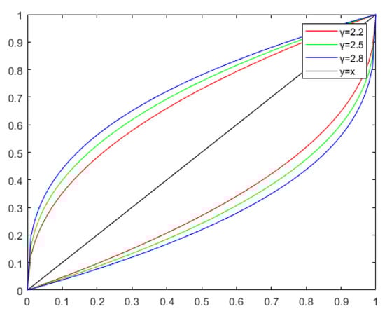 The function curves for values of 2.2, 2.5, and 2.8. The curve above y = x is V1 transformed with γ, and the curve below y = x is V2 transformed with γ. The red curve represents a γ value of 2.2, the green curve represents a γ value of 2.5, and the blue curve represents a γ value of 2.8.