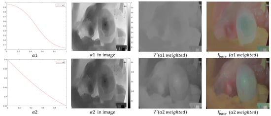 α1 and α2 function plots, weighting plots, and stretching effect plots. was set to 0.6 in the endoscopic images (see experimental analysis).