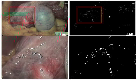 To prevent the high bright spot area in the endoscopic image from contrast enhancement in the detail layer, we decided to bring up the high bright spot before the detail layer processing and restore the high bright spot area after the processing is completed. Before making a highlight mask, the original image is pre-processed for enhancement (16). The purpose of enhancement is to make the reflective areas more visible and reduce the associated interference factors. This paper adopts the theory [25] that the reflective pixel’s brightness Y (luminance) is greater than its color brightness y (chromatic luminance). Convert the image from RGB to CIE-XYZ space to get , and then find according to the formula. The area where is greater than is extracted as the highlighted area.