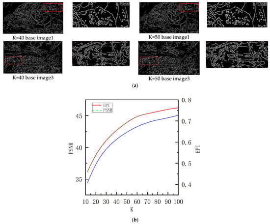 (a) The canny operator discovers the structure layer as the value of k changes. (b) PSNR of the structure layer and EPI value of the structure layer relative to the original image.