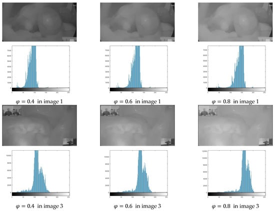 As shown in Figure 9, as the value of gradually increases, the image’s average brightness grows larger and larger, and the image’s histogram concentration value grows closer and closer to the high pixel value region. Setting the brightness enhancement to 0.6 makes it easier for human eyes to notice and judge.