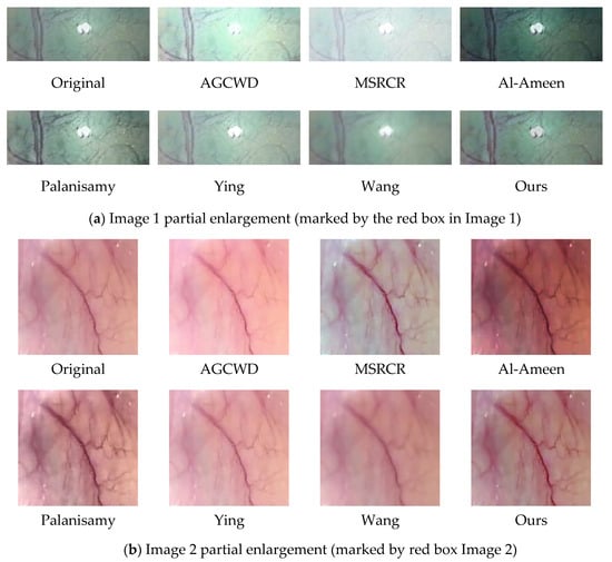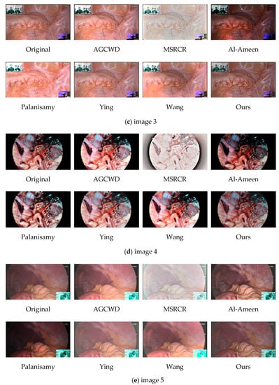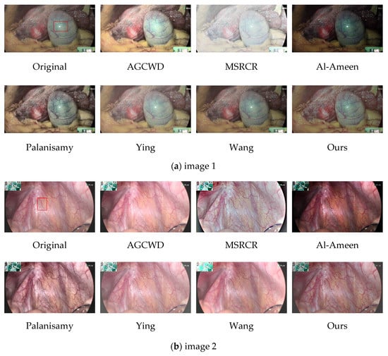 Ying et al.’s algorithm provides a significant increase in brightness, and the enhanced image is clearly visible; however, there appears to be a decrease in contrast as the brightness is increased, and part of the subject architecture is blurred, resulting in the loss of some information in the enhanced endoscopic image. This defect is highlighted more clearly in Figure 11b.