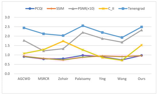 In terms of picture quality, this algorithm’s PSNR values are higher than those of other algorithms, implying that the reconstructed images are of higher quality. In terms of Tenengrad gradient index, the approach given in this study is pretty near to both the algorithm proposed by Palanisamy et al. and the algorithm value of adaptive gamma correction, showing that the clarity aspect is also ensured.