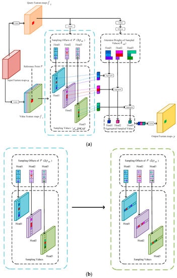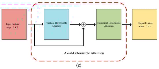 where, is the attention head, and is the total head number which was set to 8 in this study. In a certain column or a certain row, is the sampled key and is the total sampled key number, which was 4 in this study. and were both built via linear projection over the query feature maps obtained via linear projection over the input feature maps. A tensor with all elements of 0 was designed, which was concatenated with in the last dimension through two different ways to build the tensor to the sample only in the vertical or horizontal direction, rather than in all regions similar to DAM. and denote the sampling offset and attention weight of the sampling point in the attention head, respectively. is operated by softmax function with range [0, 1]. As in DAM [23], the bilinear interpolation was used to solve the problem that was fractional. obtains value feature maps and represents dividing into parts along the channel axis. represents concatenating the outputs of all attention heads.