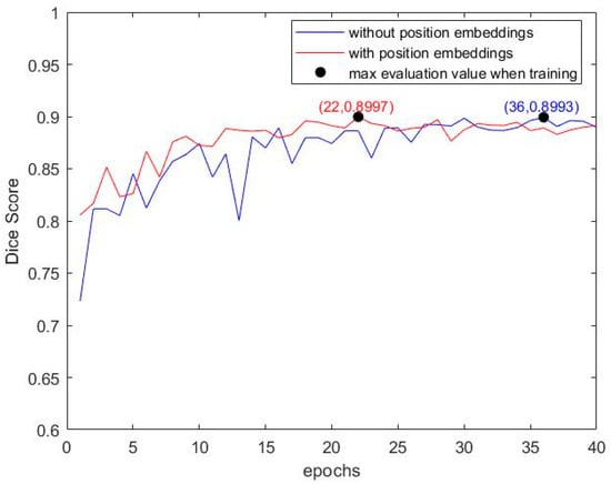 Then, the effect of components in LGMSU-Net was explored and the experimental results were listed in Table 2. As seen in line 2 of Table 2, replacing some convolution operations in “BN“ with “ADA” significantly promoted BTS performance, revealing that fusing global features and local features could effectively improve the segmentation performance. Meanwhile, the number of parameters of the model in line 2 decreased but the inference time increased, which was consistent with the analysis of Table 1 that an ADA module had fewer parameters and more computation than the replaced convolution operations. Moreover, the use of positional embeddings in the study [27] slightly improved the BTS performance but greatly speeded up the training process, as shown in Figure 3. Specifically, in the early stage of training, the model with positional embeddings performed better and achieved the best validation result at the 22nd training epoch, while the model without positional embeddings achieved the best validation result until the 36th training epoch. Moreover, the separate use of MSI (line 4 of Table 2) and MSO (line 5 of Table 2) both improved the network performance, revealing that the multi-scale features were important for the BTS task. Further, the simultaneous application of the MSI and MSO, as shown in line 6 of Table 2, further improved the BTS performance. Finally, the number of increased parameters and inference time of all the components we used in LGMSU-Net were acceptable compared with the improved performance.