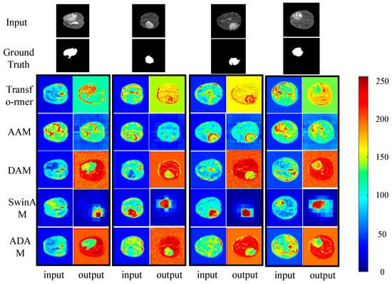 As shown in Figure 4, the heatmap of the output results of our proposed ADA module showed the strongest contrast between the brain tumor and the background region, and the contour position of the brain tumor was the clearest, which proved that the proposed ADA module was effective on the BTS task. To be specific, the outline, location, and size of brain tumors were not clear in the output heatmaps of Transformer and AAM modules and the output heatmap of SwinAM was composed of many windows after calculating the global attention in a sliding window. Although, the DAM module’s output heatmap was similar to that of ADA, the tumor region in the ADA module’s output heatmap was cleaner and more strongly contrasted with the background, which explained visually why our proposed ADA module worked better.