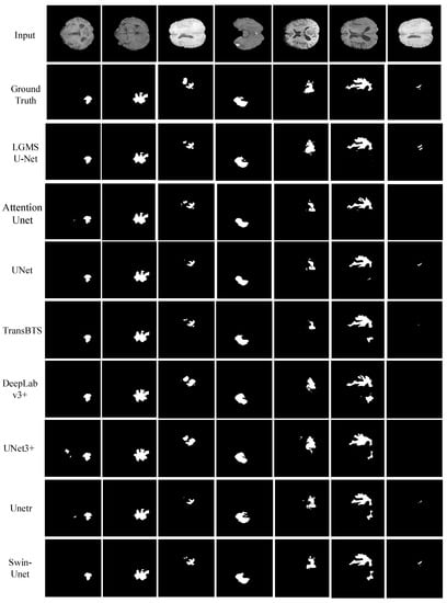 To further evaluate the performance of the proposed model, we conducted contrast experiments between the proposed LGMSU-Net and seven other state-of-the-art methods, namely UNet [11], DeepLab v3+ [12], AttentionUnet [37], UNet3+ [16], TransBTS [20], Swin-Unet [26], and Unetr [38] to verify the feasibility and efficiency of LGMSU-Net and showed the experimental results in Table 4. As shown in the table, the UNet model achieved ideal segmentation performance for the BTS task. Although there were only slightly more parameters and inference time, the AttentionUnet significantly improved the BTS performance compared with UNet, which indicated that the attention mechanism was beneficial to the BTS task. UNet3+ and DeepLab v3+ both greatly increased the parameters and used multi-scale features. However, their segmentation results were worse than those of UNet, which proved that fusing multi-scale features and local features without careful design might damage the performance of models for the BTS task. TransBTS added four Transformer layers at the bottom compared with UNet, which greatly increased the parameters but only improved the performance a little. This showed the effectiveness of global features and also indicated that TransBTS did not use global features correctly. As shown in line 7 of Table 4, the Unetr whose encoding path without no convolution operations had the maximum number of parameters but the second to last result, which revealed that local features used to obtain detailed information played an essential role in the BTS task. Meanwhile, the worst segmentation performance for the BTS task was obtained using Swin-Unet, a pure Transformer with no convolution operations, which again implied that only extracting global features and ignoring local features were not feasible for the BTS task. Finally, the proposed LGMSU-Net, whose inference time was fast enough, was the highest in Dice score, mIoU, and Recall evaluation metrics and had the third-smallest number of parameters among all eight advanced models. The comparison of the experimental data in columns 6 and 7 in Table 4 showed that the recall indexes of all models were generally low. This may be due to the high false-negative rate caused by the large background area in the data.