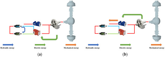 At higher speeds, as shown in Figure 3b, it enters the EERB mode, and the working state of the motor is a generator. The kinetic energy on the axle goes through the output shaft to the planet carrier and then to the sun gear, and the drive motor connected to the sun gear plays the role of a generator and outputs electrical energy is recycled into the battery. If the battery capacity is full at higher speeds, Then the hydraulic system performs energy recovery. When driving, this energy can be reused to improve energy-saving effects. And when the vehicle is parked or running, the electrical energy in the power battery pack can be transformed into hydraulic energy and stored in the hydraulic accumulator.