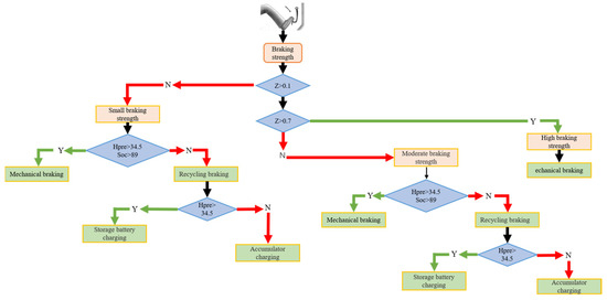 According to the proposed braking power distribution method, the logic diagram of regenerative braking system control strategy is established, as shown in Figure 5: In the diagram, “Y” and “N” indicate “compliance” and “non-compliance”, respectively.