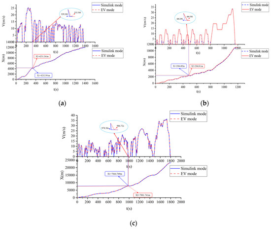 Firstly, as shown in Figure 8, the MSEHH-EV was simulated under three operating conditions, and the braking distance was compared with that of the pure EV model certified by AMESim. It can be easily concluded from the speed curves (the curve above each figure) that the stopping time of MSEHH-EV is earlier than that of EV in each braking condition in the three conditions, and the maximum difference of braking distance between a MSEHH-EV and EV in the three conditions is 15.65 m, 21.97 m, and 21.45 m, respectively, calculated from the displacement curves, which fully verifies that the simulation model has better braking safety.