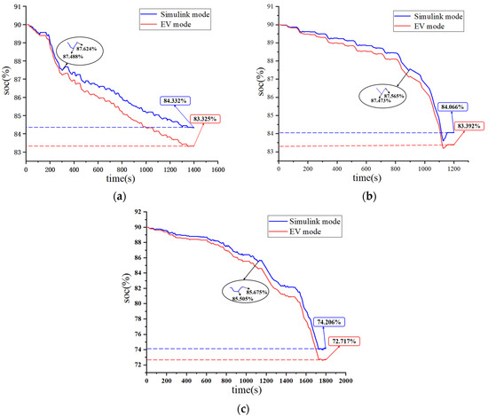 Figure 9 shows the change of battery SOC for both models. Among them, Figure 9a is the simulation result under the UDDS condition, Figure 9b is the simulation result under the NEDC condition, and Figure 9c is the simulation result under the WLTC condition. The blue line is the battery SOC curve of the test vehicle, and the red line is the battery SOC curve of the EV, and it is easy to conclude that the energy consumption of this simulation model is less than that of the EV under the three working conditions. The energy consumption is reduced by 17.766% in UDDS operation, 11.358% in NEDC operation, and 9.427% in WLTC operation, as shown in Table 3, which proves that the model has a better electric energy recovery effect, and also proves that the incorporation of a hydraulic system in the model has a significant energy-saving effect. In summary, the MSEHH-EV has a better braking energy recovery effect, thus, in conclusion, the MSEHH-EV has a better braking energy recovery effect and thus a better range than the EV.