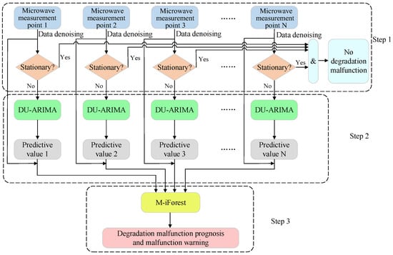 The proposed radar transmitter degradation fault prognosis model combines the advantages of DU-ARIMA and M-iForest. A flow chart of the model is shown in Figure 1. The model consists of three steps. Step 1: microwave measurement and data pre-processing. Step 2: the adoption of DU-ARIMA for data forecasting. Step 3: the M-iForest model to detect the degradation malfunction.