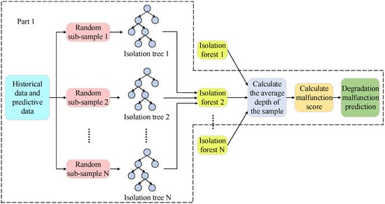 For the difficulty of obtaining degradation malfunction samples, the multiple isolation forest (M-iForest) model is selected to predict the degradation malfunction of historical monitoring data and predicted data. To know what M-iForest is, it is necessary to start with isolation forest. Isolation forest is an effective unsupervised outlier detection model [29]. Its main idea is that outliers are few and different.