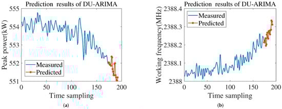 To verify the feasibility and validity of the proposed model, the first type of degradation malfunction data is selected for the experiment. The first 90% (173) of the denoising data is selected as the historical data. ADF and KPSS are used for the stationarity test. The return value and stationarity results of the test are shown in Table 2. It can be seen from the table that the two historical data are non-stationary series, so DU-ARIMA needs to be used to predict the data of the next 10% (19). The DU-ARIMA(1,1,10) model should be used for the data prediction of peak power and the DU-ARIMA(3,1,13) model for operating frequency. To obtain more accurate data prediction results, we set the prediction time-step . The prediction results are shown in Figure 6. The predicted data are compared with the real monitoring data, and the RMSE is calculated to evaluate the DU-ARIMA model. Partial magnifications of the prediction result and RMSE are shown in Figure 7. It can be seen from the figure that the RMSE of the two microwave measurement points predicted by DU-ARIMA are 0.068333 and 0.0077417, respectively, which are much lower than the 0.15848 and 0.028292 in [21]. The experiment results show that the DU-ARIMA has higher a prediction accuracy.