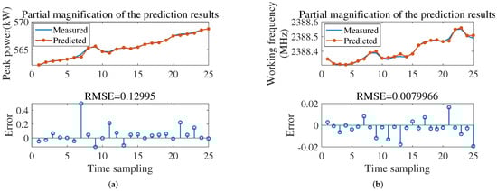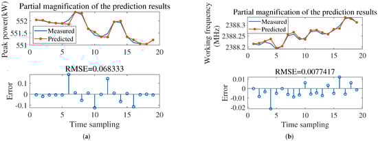Partial magnification of prediction results and RMSE of the first type of degradation malfunction. (a) Peak power. (b) Working frequency.