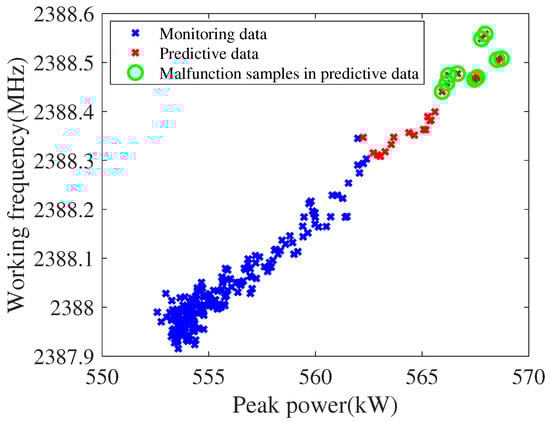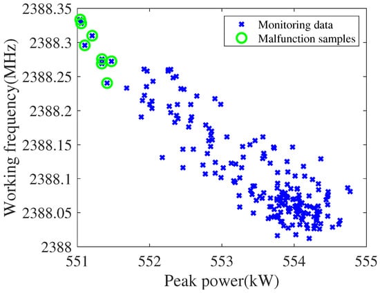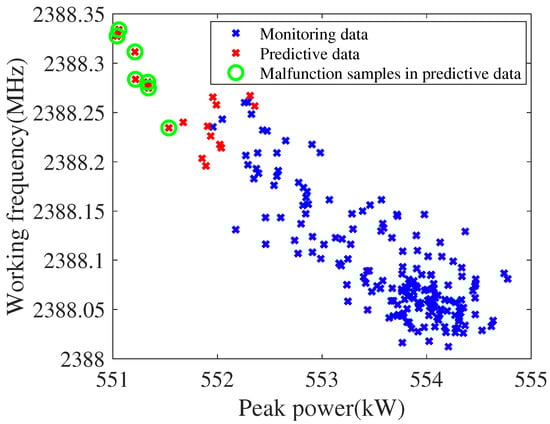 It can be considered that the predicted data can represent the actual data on the basis of DU-ARIMA’s accurate prediction of the data. At this time, the unsupervised M-iForest model is used to detect the degradation malfunction for the historical data and the prediction data of the two measurement points (peak power and operating frequency). In the experiment, the number of random sub-sampling is 256, the number of isolated binary trees is 100, and the number of isolation forests is 10. The model provides the alarm time-step for the degradation malfunction and uses AUC to evaluate the model. The experimental results are shown in Table 3. It can be seen from the table that the average of the AUC is 0.9895 (close to 1), which means that the model has a strong generalizability. The variance of AUC is 0, that is, the model is stable. The earliest alarm time-step is 183. This indicates that the M-iForest model can predict the degradation malfunction 10 time-steps (100 min) in advance. Since the two-dimensional data has the characteristic of visualization, the visualization results of the experiment are shown in Figure 8. The samples marked by the green circles in the Figure 8 are the malfunction alarm samples detected by M-iForest. Obviously, these samples are more alienated from other samples, so they are more likely to be detected as malfunction samples.