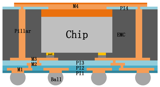 As shown in Figure 1, the FOWLP includes the four RDLs (M1, M2, M3, M4), four dielectric layers (PI1, PI2, PI3, PI4) ( = 3.08, tan = 0.02), epoxy molding compound (EMC) ( = 3.7, tan = 0.009, h = 200 m), mega pillars, silicon chip, and solder ball arrays. The mega pillars are developed for vertical interconnection. The RDLs have a minimum line width and line spacing of 10 m. The pitch of the solder balls is 450 m, and the diameter is 250 m.