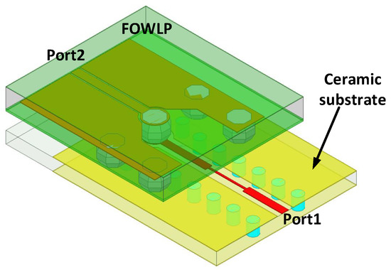 Usually, the transition for the chip-package-board should be considered for the electrical performance of the package. In this paper, the CPW transmission line was chosen as the transmission line in FOWLP because it can be easily connected to the GSG die pad on the chip. Since no test chip was fabricated, as shown in Figure 3, only the CPW transmission line on M1 of the FOWLP and the package-board transition will be optimized and measured.