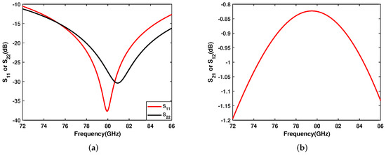 S parameters of the designed delay line structure. (a) S or S, (b) S or S.