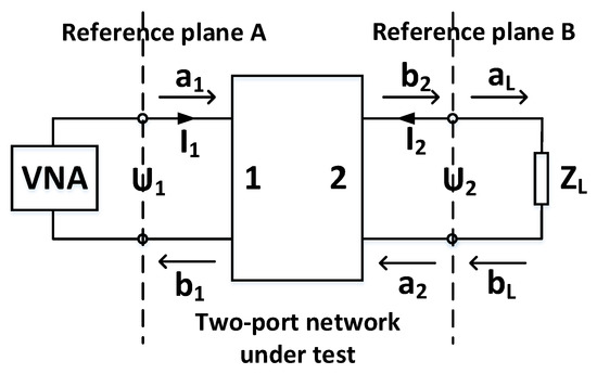 Figure 6 is the block diagram of the port reduction technique [30]. As shown in Figure 6, we can use a vector network analyzer to perform single-port tests on the reference planes B and A, respectively. The represents the standard load. The S-parameter matrix of the two-port network can be expressed as