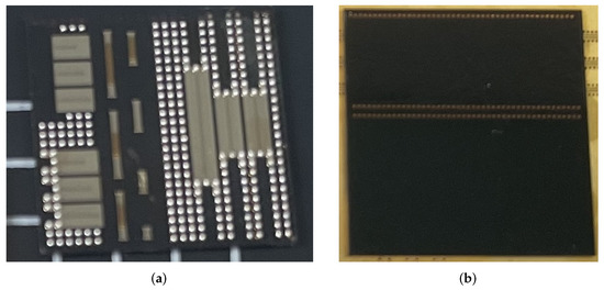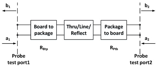 Usually, an open circuit, a short circuit, and a 50 or 75 resistance could be used as the standard loads. In this study, as shown in Figure 7, three open-ended transmission lines with different lengths on the RDL were used as the loads . The reference plane B in Figure 7 represents the test port on the RDL, and the reference plane A represents the test port on the test board. The reference planes in Figure 7 are the same as that in Figure 6. Before the package is mounted on the test board, the (i = 1, 2, 3) of the three one-port standards should be measured by the probe at the pads on the reference plane B. Then, after mounting, the could be measured at reference plane A on the test board. With the measurement results, we can get a system of equations as shown in Equation (4), and the S parameter of the transition can be easily calculated at every basic frequency.