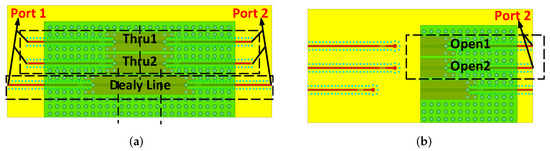 We should perform tests on port 1 and 2 in Figure 9a to get S parameters (, ) of the networks containing the thru, delay line structures. And we should get the reflection coefficient () of the network with the open structure on port 2 in Figure 9b. For networks containing the thru and delay line structures, we get their wave cascading matrix () [32] from the S parameters as shown in Equations (5)–(7). Equation (5) can be obtained from Equation (1). The matrix R in Equation (5) is known as the wave cascading matrix.