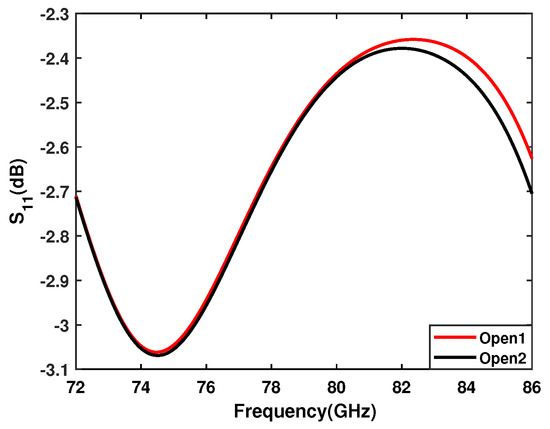 The S parameters of the open, thru, and line structures shown in Figure 9 are obtained through the electromagnetic simulation software. Figure 16 shows S parameters of the thru structure. Thru 1 and thru 2 represent the thru structures shown in Figure 9a. They have the same structure, but the environment is slightly different. This leads to some differences in their S parameters. Therefore, we finally used the results of thru 1 and thru 2 to perform subsequent calculations, respectively. The return loss of the thru structures further prove that a good package-board transition has been obtained. Figure 17 shows S parameters of the line structure, and Figure 18 is for the open structure. We can see that the S of the open 1 and open 2 structure is basically the same, so we only use the S of open 1 for subsequent calculations.
