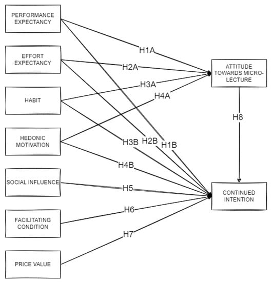 Based on Figure 1, the UTAUT2 model was formed from 7 elements, namely performance and effort expectancies, social influence, facilitating conditions, hedonic motivation, price value, and habit []. Compared to the initial version, the proposed UTAUT-2 extension produces a substantial increase to explain the variance (R2) in intention behavior from 56% to 74% and usage behaviors from 40% to 52%, respectively []. Moreover, the model is used to explain students’ behavioral intentions and teachers’ attitudes towards online learning media [,,]. Despite these conditions, some studies criticized that UTAUT-2 was still rarely used in various countries and contexts []. This led to the selection of the proposed model, which is expected to increase the variance explained in the factors influencing students’ continuous intention to use micro-lectures after the pandemic. Figure 2 shows a proposed model illustrating the initial hypothesis to explain the assumed influential factors of the learning media’s continuous intention. This proposed model was derived from UTAUT-2 (Venkatesh et al. []) and modified through the addition of attitude, as a variable affecting students’ continuous intention based on previous reports. The hypotheses of this study are as follows.