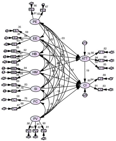 A structural equation modelling (SEM) was used to test the predictive models and analyze the relationship among variables. This approach has been widely used in the social science fields to analyze and evaluate the suitability of the theoretical model through empirical data [,,]. SEM is also appropriately considered to test the assumptions in student or teacher acceptance of online learning media [,], such as micro-lectures. Meanwhile, the literature on SEM has demonstrated the need to adopt different approaches, based on the type of study, as well as sample normality and size []. In the present report, covariance-based SEM was used according to the referential recommendations from Hair et al. [], where the objectives were to test, confirm, and compare alternative theories. This indicated that the first and second reflective measures were used according to the techniques frequently used in UTAUT-2, the theoretical approach, and the modelling. Based on a strong literature review, UTAUT-2 was modified by adding an attitude being influenced by PE, EE, HB, and HM, with SEM analyzing and interpreting the reliability of measurement and structural models, which specifically incorporated a linear specification reflecting the dependencies between the latent and the measured variable. In this present condition, all the analyses were performed with AMOS software, with the reliability test being conducted through the CFA-based Cronbach alpha and CR (composite reliability) [,]. Additionally, subsequent analysis was performed on each latent variable, t-value, as well as the item loading and AVE for each question and construct, respectively [,].