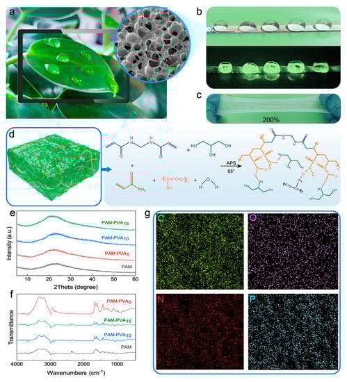 Schematic diagram and structural analysis of the PAM-PVA hydrogel. (a) The picture inspired by the response to mechanical stimuli of natural plants. (b) SEM of the hydrogel with a scale bar of 5 μm used for bio-inspired electroluminescent skin. (c) The hydrogel as an electrode for a stretchable triboelectric nanogenerator. (d) Schematic illustration of the synthesized PAM-PVA hydrogel showing the dual cross-link network. (e) XRD patterns of the hydrogel with different contents. (f) FTIR spectra of PAM, PAM-PVA5, PAM-PVA10, and PAM-PVA15 hydrogels. (g) EDX maps of the PAM-PVA10 hydrogel.