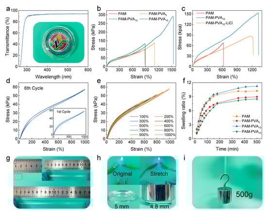 Tensile performances of the hydrogel with different polymer contents. (a) Transmittance curves of hydrogels with photos showing the transparency of the hydrogel. (b) Tensile curves of hydrogels with different components. (c) Tensile curves of hydrogels. (d) Loading–unloading cycles of PAM-PVA10 hydrogels for six consecutive cycles at a strain value of 1000%. (e) Tensile loading–unloading curves for PAM-PVA10 hydrogel at strain from 100–1000%. (f) Swelling ratio of the hydrogels as a function of time. (g) Photograph showing the high stretchability of the hydrogel. (h) Photographs of the conductivity and compressibility of hydrogels. (i) Photograph of PAM-PVA10 ionic hydrogel with 500 g weight.
