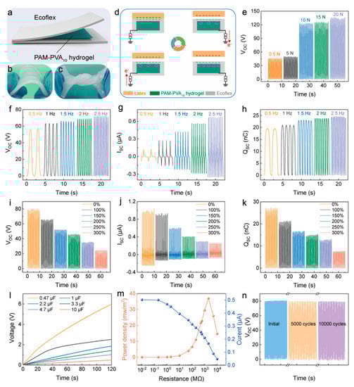 The double-network hydrogel as ionic conductor electrode was integrated with silicone to construct a transparent, stretchable, single-electrode mode SH-TENG (Figure 3a) which can be bent, twisted, and stretched, as displayed in Figure 3b,c. The detailed experimental operations are shown in the Experimental Section. Figure 3d illustrates the mechanism of SH-TENG operation [22]. As the latex contacts the Ecoflex layer, a positive charge generates at the latex layer interface in addition to a negative charge of the same quantity and opposite electrical properties at the Ecoflex interface. There is no electron flow in the external circuit as a result of the complete balance between the frictional charges. When the latex is separated from the silicone layer and moves upward, the conductive hydrogel generates positive charges in order to compensate for the negative charges on the surface of the Ecoflex layer. Electrons flow from the PAM-PVA10 hydrogel to the copper wire during the above process, producing a measurable but temporary current signal. The whole process is reversed as the latex layer moves down and approaches the Ecoflex layer. The positive charge induced by the copper wire decreases, causing electrons to flow in the opposite direction. The SH-TENG sequentially generates an alternating current continuously by repeating the operation periodically. Figure 3e illustrates that the open-circuit voltage gradually increases with increasing contact forces in the range of 0.5–20 N.