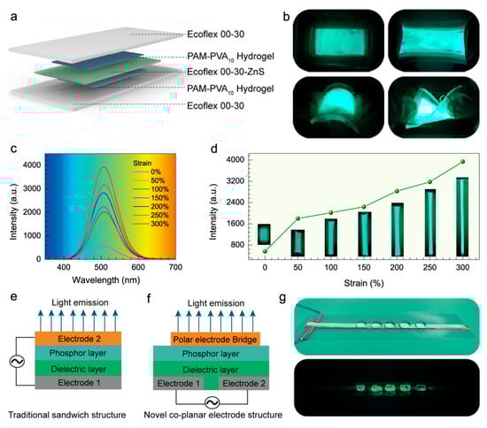 We investigated the luminescence performance of the bio-inspired electroluminescent skin under mechanical deformation. As shown in Figure 4b, the skin maintained light emission under conditions of stretching and bending, with light emission on both sides, which indicates that the skin was stable to mechanical deformation as a result of the elasticity and flexibility of the hydrogel. In terms of mechanical deformation stability, the prepared devices present brilliant emission with high homogeneity in different stretching states. As shown in the Figure 4c luminescence spectrum, the skin exhibits uniform and bright emission under a strain of 300%, where the central wavelength was 510 nm and the emission intensity increased as the tensile strain increased. The luminance intensity, as a function of tensile strain, is shown in Figure 4d. The photos show that the luminous intensity increases with increasing driving voltage. The main reason for this can be explained by the change in the thickness of the luminescent layer; the thickness of the luminescent layer gradually decreases as the stretching rate increases, which increases the electric field at an applied voltage, resulting in an increase in the brightness of the layer. The results verify the durability of stretchable electroluminescent skin to withstand a certain amount of mechanical deformation; this characteristic is critical for wearable applications. The conventional sandwich structure (Figure 4e) consists of a phosphor layer and dielectric layer sandwiched between a metal back electrode and a transparent electrically conductive front electrode, such as ITO. However, transparent electrodes are expensive and difficult to integrate into sensing modules directly, limiting their broader applications in material selection, smart wearables, and human-computer interactions. In contrast, a coplanar, non-overlapping electrode was proposed without optical transparency [34,35]. As shown in Figure 4f, light emission can be achieved by bridging electrodes (polar liquids such as water, hydrogel) on the top layer of the luminescent layer. Figure 4g displays a simple coplanar, non-overlapping electrode; it emits the bright green luminescence of a water droplet, which eliminates the limitation for transparent electrodes, and increases the prospect for a wider range of applications.