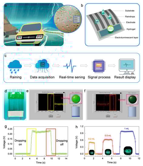 With the advantages of smart, safe, and precise positioning, car driving has become one of the most popular methods to travel; however, traffic accidents frequently occur as a result of obstructed vision in extreme weather conditions. Hence, it is proposed in this paper that a self-powered raindrop visual sensing system be used to realize real-time monitoring of raindrops and rainfall levels. The application scenario of the raindrop sensing sensor is shown in Figure 5a. Figure 5b illustrates the structure of the raindrop sensing sensor, and Figure 5d shows a photograph of the physical setup, which mainly includes raindrop sensing and a luminous display. The sensors receive the signal, converted to voltage signals, as the raindrops fall, and an alarm is triggered when the minimum threshold is reached, in order to remind drivers of the arrival of rain. At the same time, raindrops as a bridge electrode fall on the coplanar electrode to achieve intelligent luminescence and alarm indication in the dark that significantly enhances the warning capabilities for night driving. As shown in Supplementary Video S2, the luminescence can also be realized during the stretching process, revealing excellent luminescence performance and stability, which can be widely applied in smart wear and stretch sensing in the future. Figure 5c and Supplementary Video S3 demonstrate the real-time monitoring process of the self-powered raindrop sensing system during an actual weather monitoring process; the system converts the raindrop signal into a real-time voltage signal through the signal acquisition and processing conversion system. Screenshots of the self-powered raindrop sensing system in real-time are shown in Figure 5e,f; the system attaches easily to the vehicle window, demonstrating the practical application feasibility and enormous potential for raindrop monitoring systems. Meanwhile, the voltage variation for a complete period, from raindrop impacting to dropping off, is shown in Figure 5g. The voltage signal increases sharply as the raindrops land, while the voltage decreases as the drops evaporate and disappear, returning to baseline value. Furthermore, the magnitude of the voltage is closely related to the amount of rainfall. Figure 5h illustrates the voltage output signal for different rainfall amounts, indicating that the voltage signal increases with the amount of rainfall, which has significant implications for future rainfall monitoring and intelligent flood control.