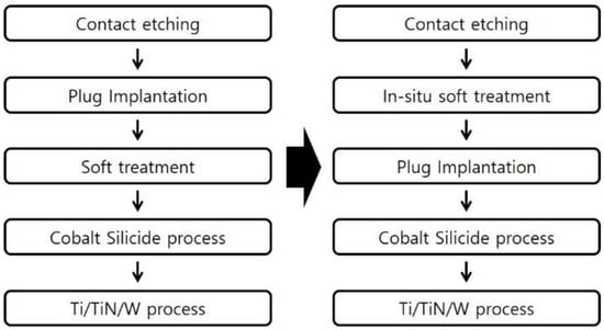 Based on basic planar MOSFETs, our samples were produced in the order shown in Figure 1 using the reliable facilities of Samsung Electronics. DRAM technology was used, including 2.5 nm of the equivalent thickness of the gate oxide and 40 nm of the distance between the gate and the DC. As shown in the left side of Figure 1, the plug implantation proceeded after DC etching for the standard process. For our suggested experiments, an in situ soft treatment process was introduced immediately after the DC etching in the same capacitively coupled plasma (CCP) equipment as shown in the right side of Figure 1.