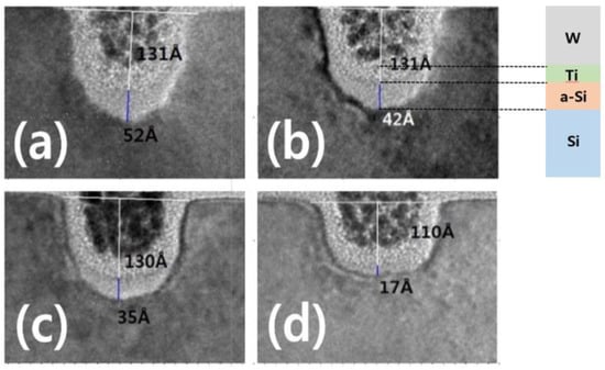 Transmission electron microscope (TEM) analysis was performed to confirm how much the damaged layer was reduced by the added soft treatment process and the shape of the contact. TEM images of the silicon surface of the fabricated DC contacts are shown in Figure 2. In the case of Figure 2a, only the standard contact etching was performed without the in situ soft treatment, whereas the treatment was performed in the cases of Figure 2b,c for 10 s and 20 s, respectively. In the case of Figure 2d, a 30% reduced power was applied to originally reduce the damage by the plasma etching power itself. In the case of Figure 2a, the thickness of the remaining amorphous layer at the contact bottom was 52 Å, and in the cases of Figure 2b,c, the damaged layer thickness was reduced to 42 Å and 35 Å, respectively. It was confirmed that the damaged layer was reduced by 19% by applying the treatment for only 10 s and by 33% when applying the treatment for 20 s. On the other hand, the damaged layer is the thinnest in the case of Figure 2d, which is only 17 Å. However, the shapes of the contacts, especially the silicon substrate recesses, show many changes. Because the RF power itself was reduced by 30%, the plasma-damaged layer decreased, but it is easily found that the silicon recess in the depth direction also decreased. As shown in Figure 2a–c, the values of the silicon recess were similar to 130 or 131 Å when 0 s, 10 s, and 20 s were applied, but it was reduced to 110 Å in the case of Figure 2d. Even if the soft treatment process was performed for up to 20 s, only the thickness of the damaged layer was reduced without affecting the silicon recess. However, when the power was reduced by 30%, the silicon recess filled with W and TiN decreased by 20 Å, resulting in a large change in the shape of the contact. Since the DCs of DRAM devices have various sizes and depths, the changes in physical dimensions, as in the case of Figure 2d, may cause serious process failures. For example, the contact between word lines and bit lines, which is one of the thinnest and the longest contacts, was highly likely to be unetched in the case of Figure 2d.