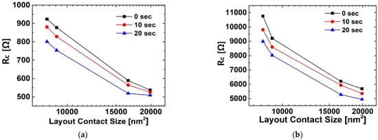 The measured RC values of (a) n+ contacts (for the source and the drain of NMOSFETs) and (b) p+ contacts (for the source and the drain of PMOSFETs) at a hot temperature (85 °C) are shown in Figure 3. As the soft treatment time increases, the resistances of all n+/p+ contacts decreased for all sizes. It is shown in Figure 3a that the n+ RC was reduced from 2.0% to 5.7% and from 5.2% to 14.1% when the in situ soft treatment was applied for 10 s and 20 s, respectively. Additionally, in the case of the p+ contact (Figure 3b), the RC was reduced from 4.5% to 8.9% with 10 s of the soft treatment and from 13.0% to 16.4% with 20 s of the soft treatment. The RC values of 0 s in Figure 3 correspond to the contact resistances of the conventional scheme. In the conventional scheme, there is no process for removing the damaged layer before the plug implantation process. Based on the layout contact size of 8460 nm2, the p+ RC decreased by 8.9% from 10765 Ω to 9805 Ω, and n+ RC decreased by 5.7% from 924 Ω to 871 Ω. This shows that the effect of improving the resistance in the p+ contacts is more pronounced than in the n+ contacts due to the reduced dopant blocking effects of the subsequent plug implantation process. To improve RC, it is important to remove the plasma-damaged layer itself, but the order of the removal process is also important. In other words, it is key to remove the amorphous layer before the subsequent plug ion implantation process is applied, and the reduced damaged layer facilitates penetration of the ions. In this experiment, arsenic ions were injected into the N+ contact and boron ions were injected at a high concentration into the p+ contact in order to make the contacts more ohmic. Because the boron ion is lighter than the arsenic ion, the effect of removing the damaged layer is more significant.