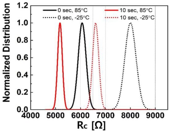 At a cold temperature (−25 °C), this RC reduction effect is more convincing. Generally, RC increases exponentially with decreasing temperature and with increasing barrier height []. This increase in resistances at a cold temperature is one of the biggest difficulties in automotive applications that must ensure operation over a wide temperature range. For this reason, this experiment focuses on improving the cold characteristics through decreasing the RC. As shown in the black solid and dashed lines of Figure 4, the RC at a cold temperature was increased in terms of both the median and the dispersion. The median value was largely increased by 31.9% from 6067 Ω to 8003 Ω, and the standard deviation was also increased by 43.4% from 157 Ω to 225 Ω. Both the median and the dispersion of the RC increased when the soft treatment was applied for 10 s as well, as shown in the red solid and dashed lines. However, the percentages of those increments were reduced to 27.6% for the median and 33.3% for the standard deviation. The standard deviation at −25 °C decreased from 225 Ω to 124 Ω after applying the soft treatment process for 10 s. This value is even less than 157 Ω, which is the standard deviation at a hot temperature when the soft treatment technique is not applied.