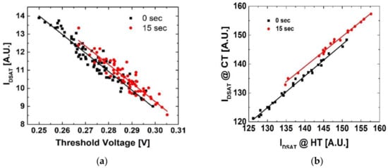 Single PMOSFET characteristics. (a) IDSAT as a function of processing time and threshold voltages. (b) IDSAT relationship between hot (85 ℃) and cold (−25 ℃) temperature.