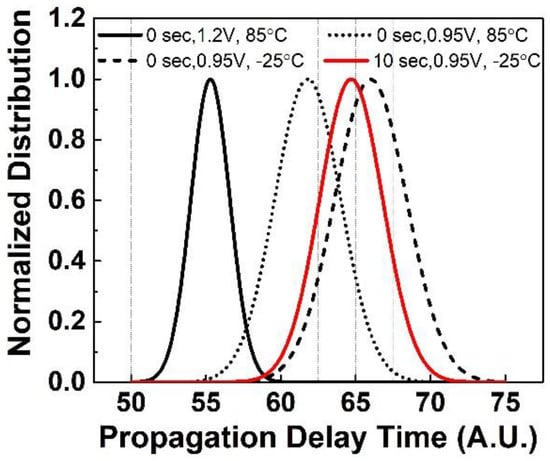 Figure 6 shows the normal distributions of the propagation delay times (tPD) with different temperatures (85 °C and −25 °C) and operating voltages (0.95 V and 1.2 V). The tPD is measured from the inverter chains which are composed of 100 inverters. By applying a simple electrical inverter model, the tPD can be written as follows: