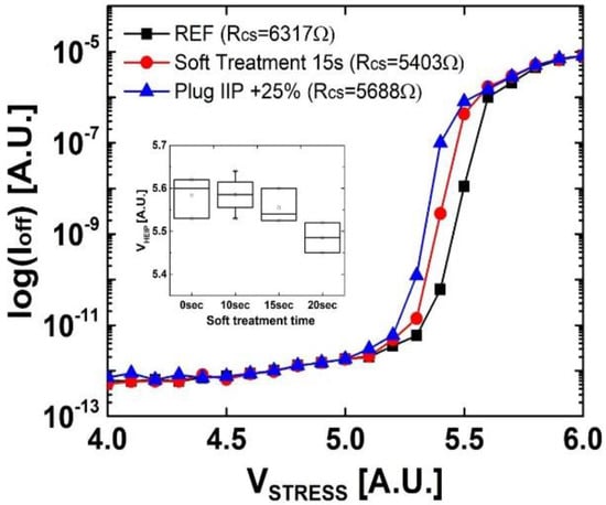 The results of the IOFF measurement in log scale are shown in Figure 8. As VSTRESS increases, IOFF increases rapidly at a certain voltage in each group. In the soft treatment application group indicated by red circles, the graph shifts to the left. This is because the gate-induced drain leakage (GIDL) and the plug effect deteriorate as the subsequent plug implantation is strengthened with the reduction in the plasma-induced-damaged layer. For reference, the graph is shifted further to the left when the amount of RC reduction is adjusted by strengthening the plug implantation by 25%. By defining VHEIP as VSTRESS when IOFF increased by 100 nA, it is found that 10 to 15 s is an appropriate process time as shown in the inset of Figure 8. VHEIP decreased by increasing the soft treatment time, but the degradation did not appear until after 10 s of treatment. VHEIP was reduced by more than 100 mV for 20 s, so that the electric field of the channel edge was seriously affected. Therefore, treatment up to 10 s has the effect of reducing resistance and reducing the tPD and is less sensitive to HEIP reliability issues; thus, it is much more efficient than other resistance reduction techniques, such as strengthening the plug implantation.