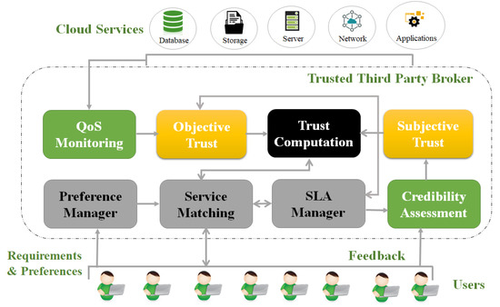 - Fan, W.; Perros, H. A Novel Trust Management Framework for Multi-cloud Environments Based on Trust Service Providers. Knowl.-Based Syst. 2014, 70, 392–406. [Google Scholar] [CrossRef]