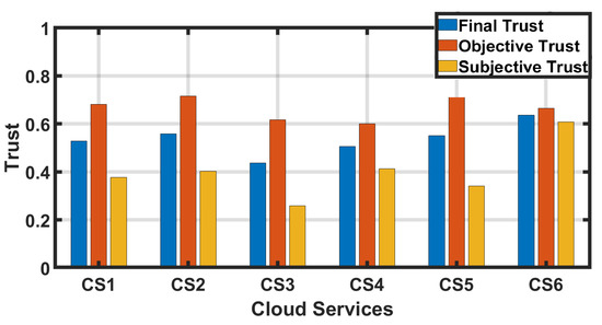 where is the weight of , and is the weight of . If in Equation (9), then only objective trust is used in computing , and if , then is computed based on subjective evidence alone. As can be observed that both and play a role in evaluating the trustworthiness of the cloud services; it is better to assign them either equal weights or decide their proportion based on the number and recentness of the evidence. A few studies maintain that should be assigned a high weight. Since objective evidence indicates the real performance of the cloud services based on the resources they have and how well they completed each task. On the contrary, if the amount of feedback from CSUs is higher, then should get a high value.