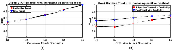 Figure 3a illustrates the trust results of cloud service computed without considering the credibility, i.e., the first case of collusion. In this case, CSUs are sending high feedback in all attacking scenarios. has 994 feedbacks. Therefore, in , the original feedback as found in the dataset is considered. In , there are 249 high feedback values, while the rest of them are original. Likewise, in , , and , there are 497, 746, and 949 high feedback values, respectively.