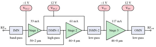 In consideration of the mismatch, transmission loss, process variation, and maximum available gain (MAG) of transistors, a cascaded, three-stage, common-source architecture was employed to achieve a small-signal gain above 26 dB. Next, the unit cell periphery needed to be chosen carefully. Although the larger transistor delivers a higher Pout, the lower optimal impedance complicates broadband matching, resulting in higher loss. Moreover, additional parasitics will decrease both the fT and the maximum oscillation frequency (fmax), leading to elevated energy consumption and a deteriorated PAE. Therefore, the total gate width (TGW) of the output stage cell should be set to be smaller under the premise of fulfilling 1 W Psat, which is estimated to be 370 μm when given a 1.25 dBm trade-off margin with a moderate RF power density of 3.6 W/mm. There are three combinations for power cell implementation according to a unit gate width (UGW) ≤ 100 μm and a number of gate fingers (NGF) ≤ 8 being recommended in the foundry design manual for model accuracy reasons. Since the signal travels along the gate with a steady rise in attenuation and phase shift, and on account of phase differences between the gate fingers, excessive UGW and NGF will both cause a reduction in the forward gain. Table 1 reveals that cells with a minor UGW have better frequency response characteristics for similar TGWs, and the terminal impedances of these cells at the center frequency (f0) are fairly close to one another. As a result, the eight-finger HEMT was chosen, and the former ones were subsequently settled following a conservative staging ratio of 1:2. Regarding the soft compression phenomena of GaN-based devices, the first stage cell was slightly enlarged to 50 × 2 μm to enhance the linear driving capability, which seldom impacts the final PAE. The overall class-AB amplifier topology is shown in Figure 1.