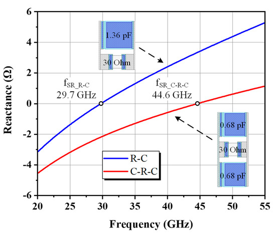 From Equations (5) and (6), at f0, the quality factor Q of Zin (i.e., Qin) is 1.7, and the Q of Zins (i.e., Qins) will be larger than Qin when (RsCs) > 10−11, meaning that the maximum attainable bandwidth will be reduced after the insertion of a parallel RC network, which may be true for gain concerns. Fortunately, the upper limit of Q is 2.7 according to Q = f0/BW, with a conservatively designed bandwidth of 10 GHz. In fact, there is enough room for us to achieve the desired compromise between stability, bandwidth, and gain under the obtained boundary condition. We finally chose a stabilization network consisting of two identical 0.68 pF capacitors in parallel with a 30 Ω resistor for the output stage cell, with a Qins of 2.24 determined by Equation (4). In addition, by substituting the reactance X slopes of the two curves in Figure 3 at fSR into Equation (7), it is found that the series parasitic inductance represented by the C-R-C structure is reduced by half, from 21.2–9.6 pH, compared to the conventional R-C one, thereby boosting the fSR to 44.6 GHz.