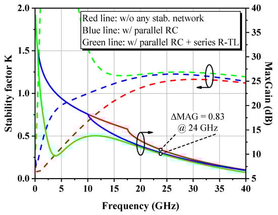 Simulated K-factor and MAG of the 46 × 8 μm GaN transistor, with and without stabilization networks.
